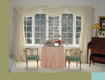 Colors chosen for the velvet seats of the antique chairs and chiffon table skirt reflect the colors of the Spring Magnolia trees outside. Mary Ellen McKee-Curtis designed the room to facilitate verbal as well as musical conversation, surrounded by a collection of family photographs. The stately draped window treatment adds a traditional touch of grace to the room. |
