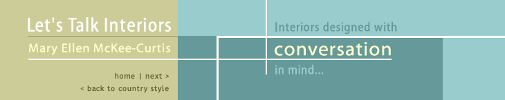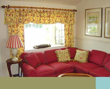 Bright reds and yellows make this country style sitting room a delightful space for conversation. Mary Ellen McKee-Curtis placed the sofa in front of the bay window both to maximize the space of the room and provide a view. The floral fabric window treatment coordinates with the toss pillows, and the red sofa is accentuated by the candy cane stripes of the lampshade. |